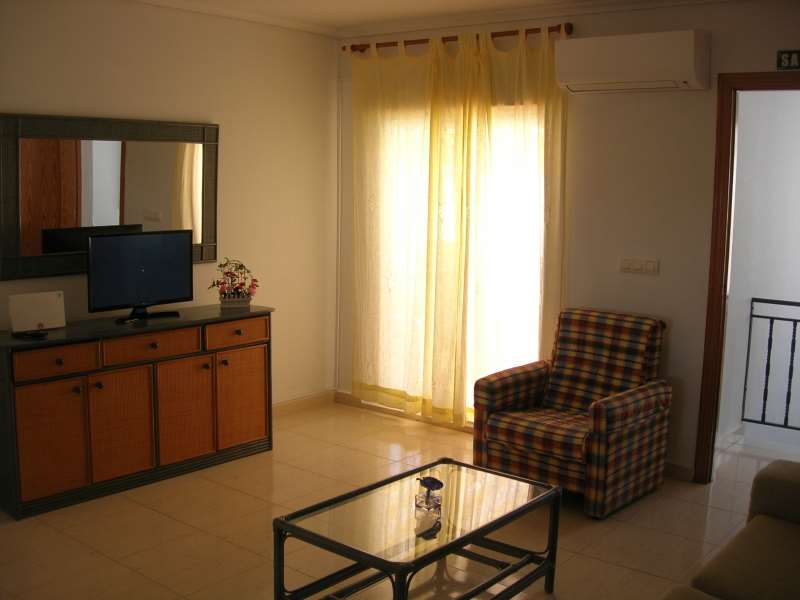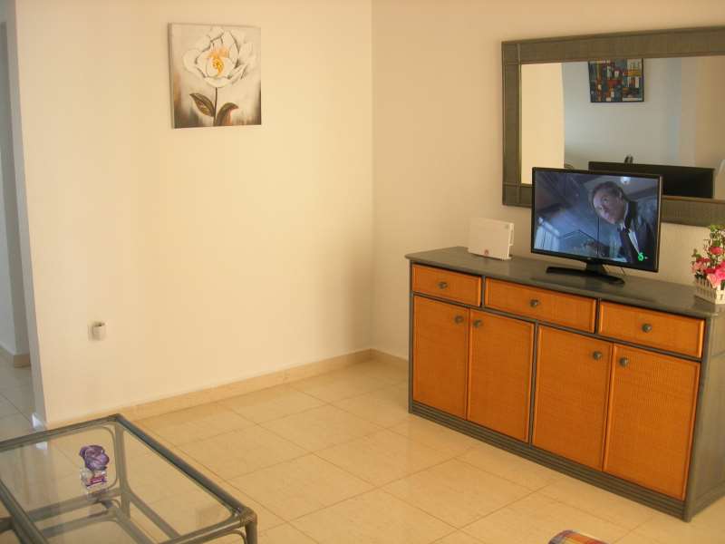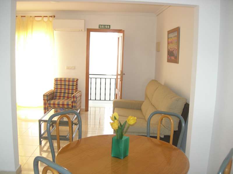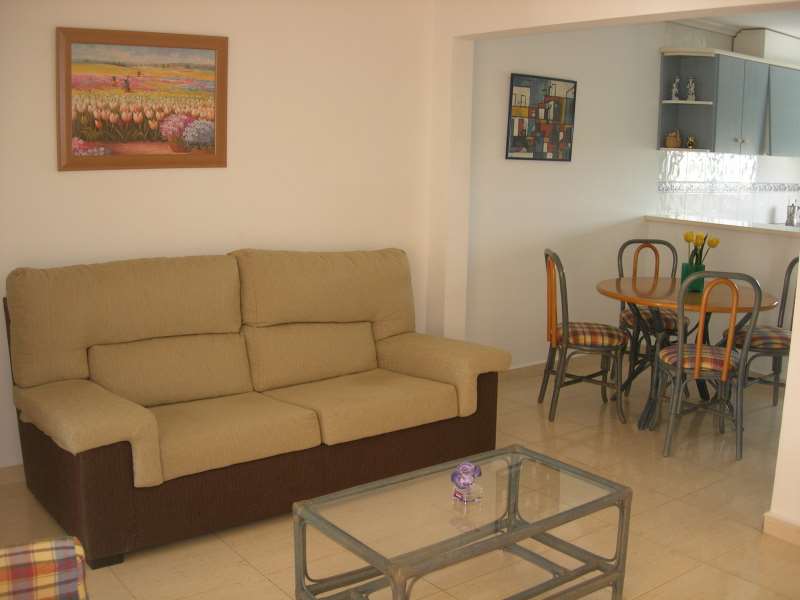 Tiene un amplio salón con un sofá de 3 plazas, un sofá individual, una mesa de centro y un mueble aparador, TV 28'' con acceso a internet y aire acondicionado Daikin de 3500 KW. Tiene una cocina americana en forma cuadrada muy cómoda totalmente amueblada, con vitrocerámica, nevera, horno y microondas. Entre el salón y la cocina esta el salón comedor con una mesa redonda con 4 sillas. El acceso a la terraza es a través del salón, la cual tiene forma rectangular con un amplio toldo, una mesa redonda, y 4 sillas de jardín.