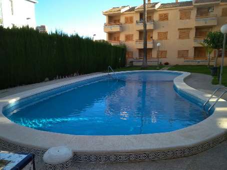 Zonas ajardinadas y piscina comunitaria con fácil aparcamiento.
