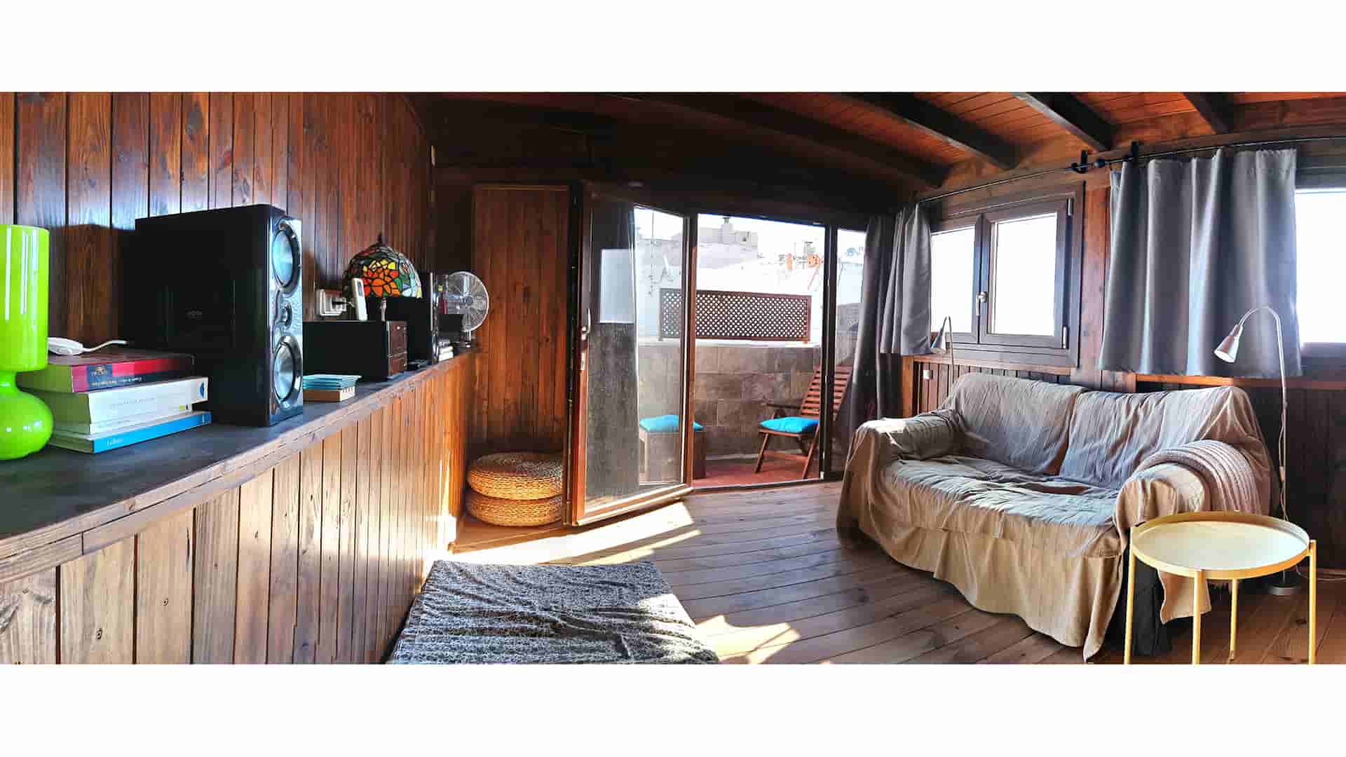 En la tercera altura hay una habitación con terraza, un sofá, dos colchonetas, mesa auxiliar, equipo de música para conectar todo tipo de dispositivos, mp3, ipod, cd, y radio. También hay libros de lectura.