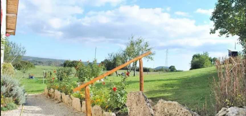 The garden is sunny is delimited wood overlooking a landscape of mountains with green terrain.Â