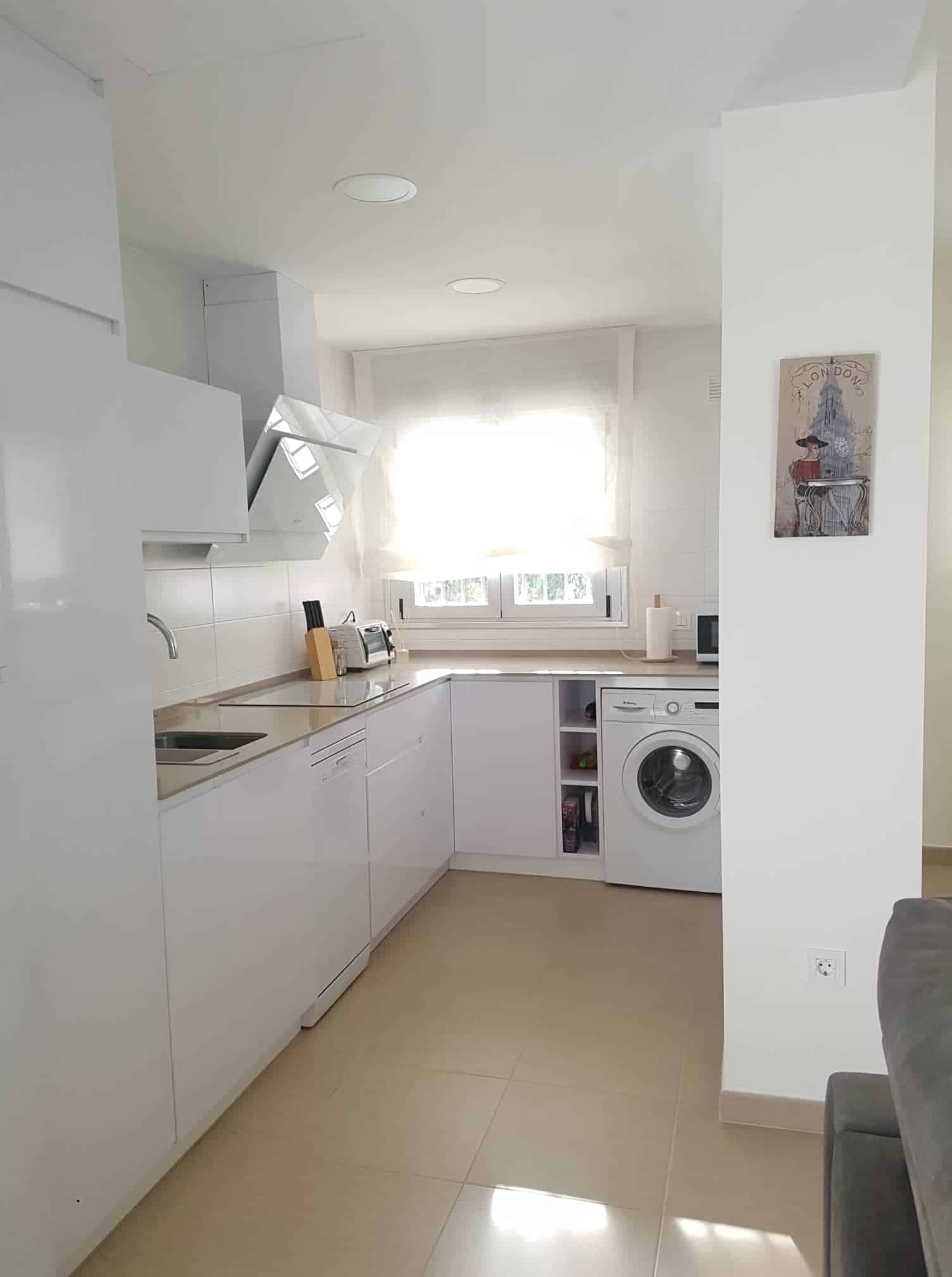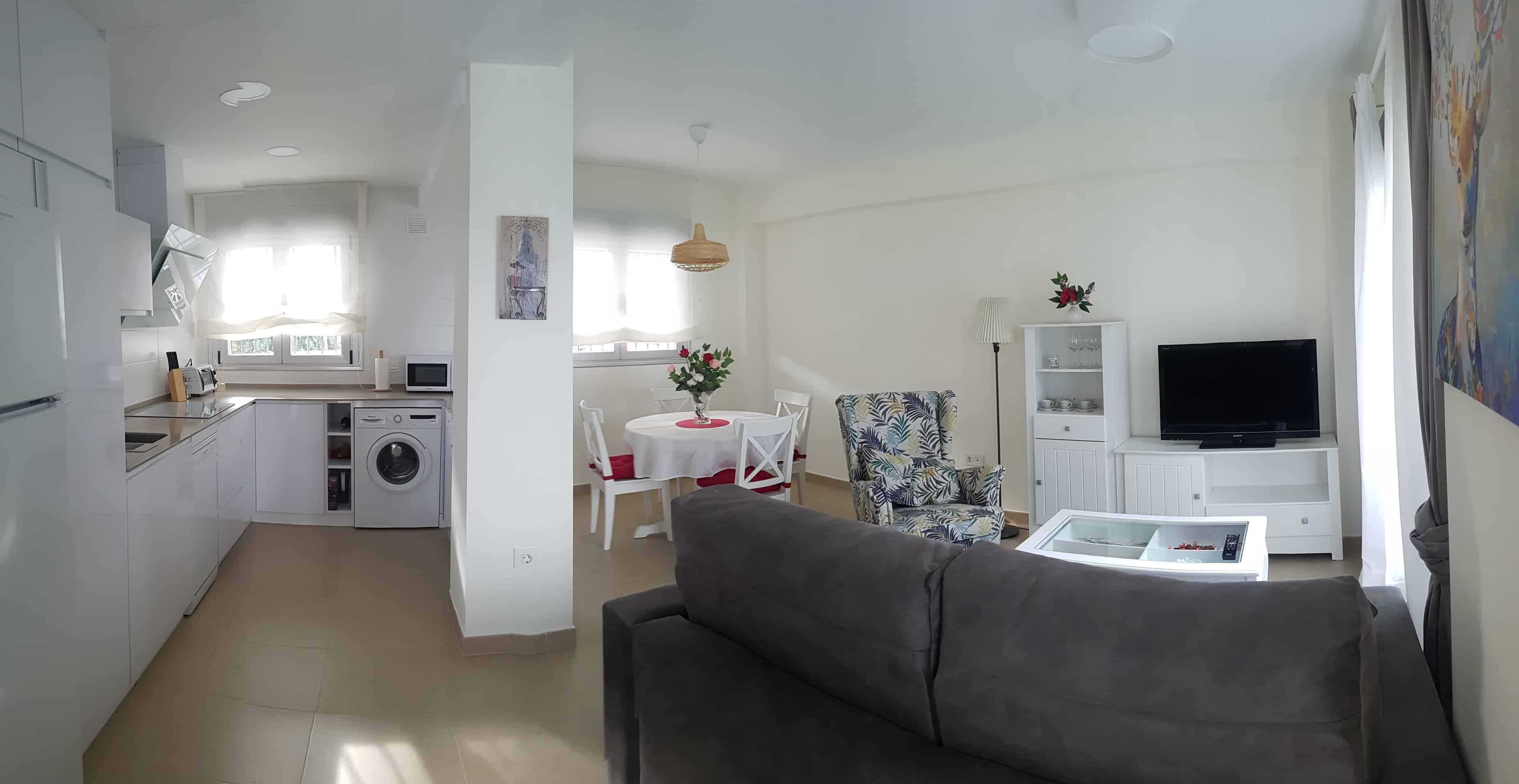 Salón cocina con utensilios Básicos, microondas, lavavajillas, lavadora, frigorífico, tostador-horno, cafetera, exprimidor, batidora, dispensador de jabón Integrado, plancha y tabla de Planchado, tendedero y televisión plana.