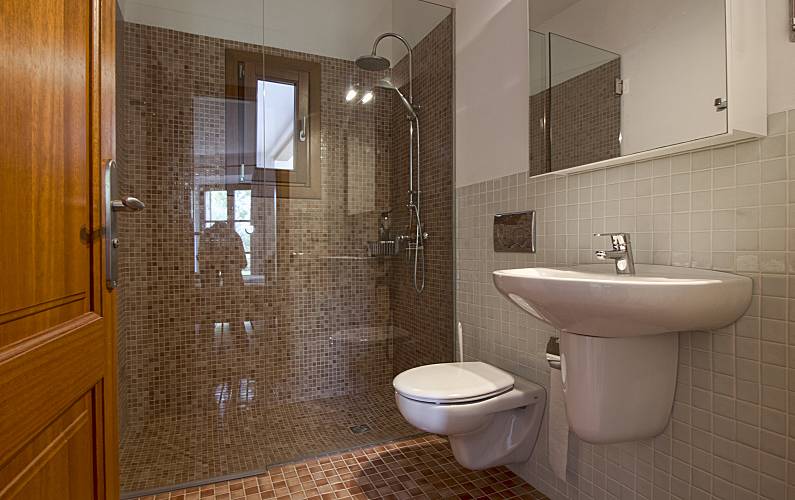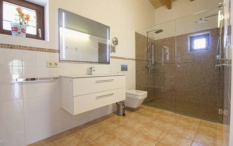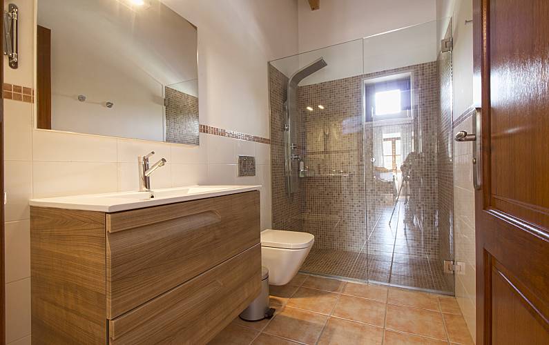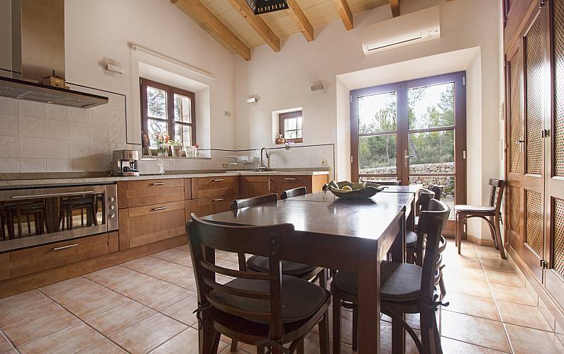 Majorcan stone house, decorated with rustic style, located on a hill which gives extraordinary views of the heart of Mallorca, surrounded by nature on all four sides, consists of two floors, the kitchen floor consists of living room dining room with table for 12 people, tv room with fireplace and sofa for 12 people, large kitchen, bathroom, bedroom with bathroom in suite and dressing room, leaving through the dining room door access to the outdoor terrace where the pool is located surrounded by a large solarium. from inside the dining room we access by a staircase to the lower floor where the other five rooms are located, we find a room with double bed another with double bed and bathroom en suit and wardrobe another with double bed with en suite bathroom and closet, bathroom in the hallway, laundry room
