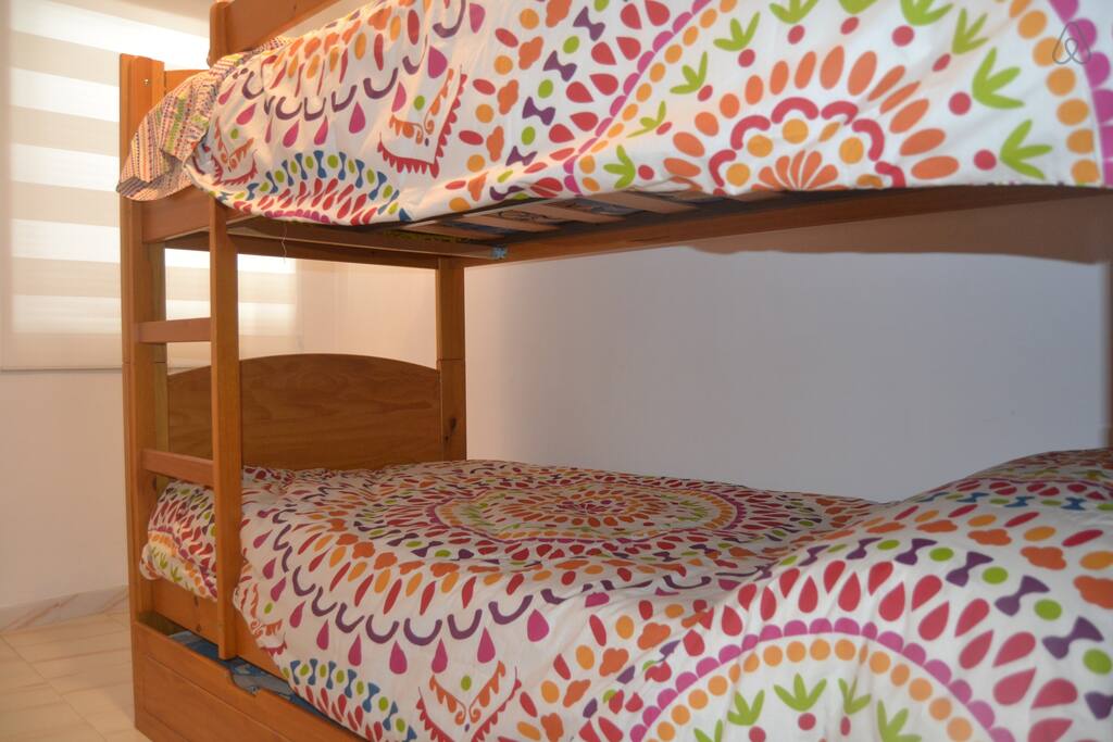 Subimos un tramo de escaleras y están los dormitorios, 2 de matrimonio y 1 con tres camas individuales (1 litera y 1 arrastre), un baño y una zona de lectura.