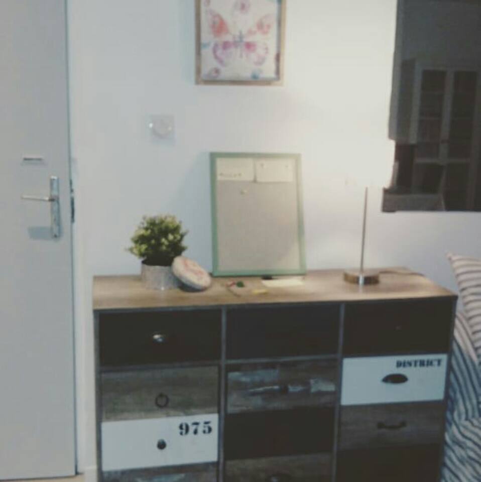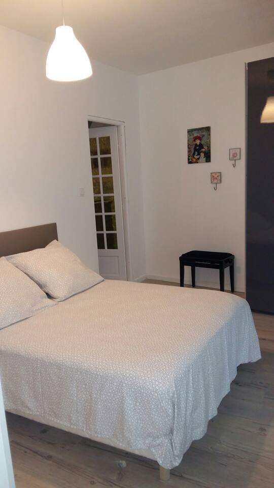 Very large with wardrobe dressing. Office space.work. separate en-suite bathroom. Bathtub. Storage column. Washing machine silent. Hair dryer. Vacuum . Double bedding upscale hotel. Memory of form. Balcony window and with electric blind. Overlooking recently pedestrian street. Calm.