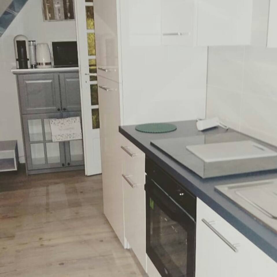 KITCHEN: Oven, fridge freezer. New machine Vertuo Nespresso coffee. Toaster.Kettle.Micro wave. Dishes and everything to cook ..