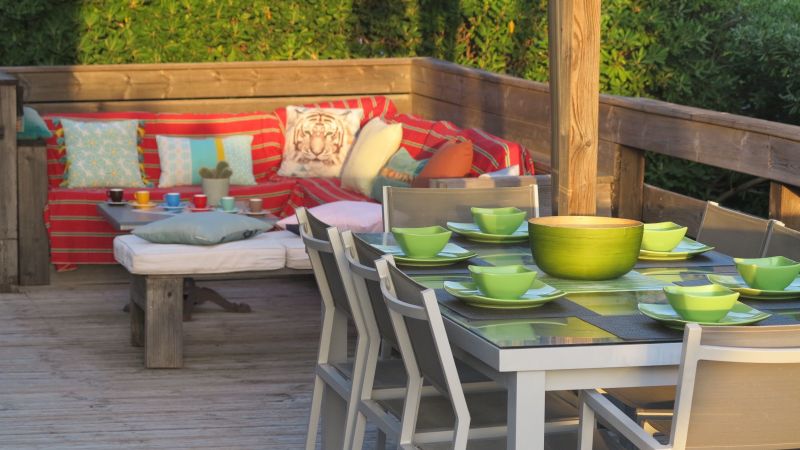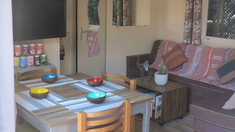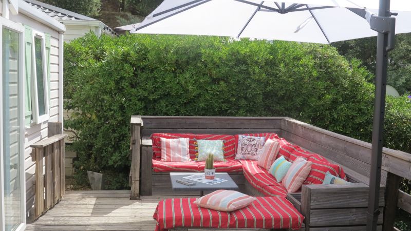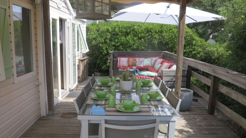 36m2 mobile home with a beautiful 55m2 terrace (18m2 for the largest bungalows on the campsite) with a pleasant outdoor lounge, a table that can accommodate up to ten guests, a gas barbecue, a plancha electric, 3 deckchairs, a top freezer useful for long stays, a very appreciable outdoor shower in the garden area. Fully equipped kitchen with 4 gas burners, complete crockery, fridge-freezer, microwave oven plus another microwave, nespresso machine, kettle, toaster etc ... Mobil-Home really very pleasant to live in privacy, quiet and without any vis-à-vis !!
