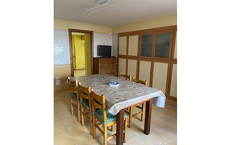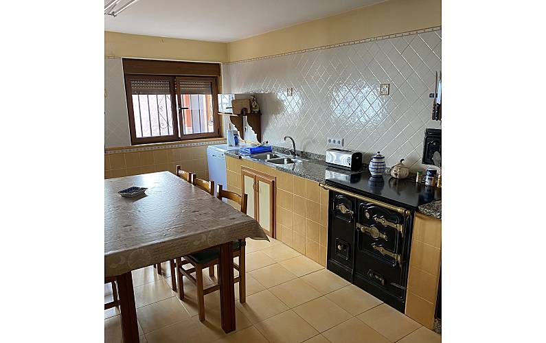 Cuanta con una cocina muy amplia que tiene una mesa grande con capacidad para sentarse a comer o a desayunar de hasta 10 personas.