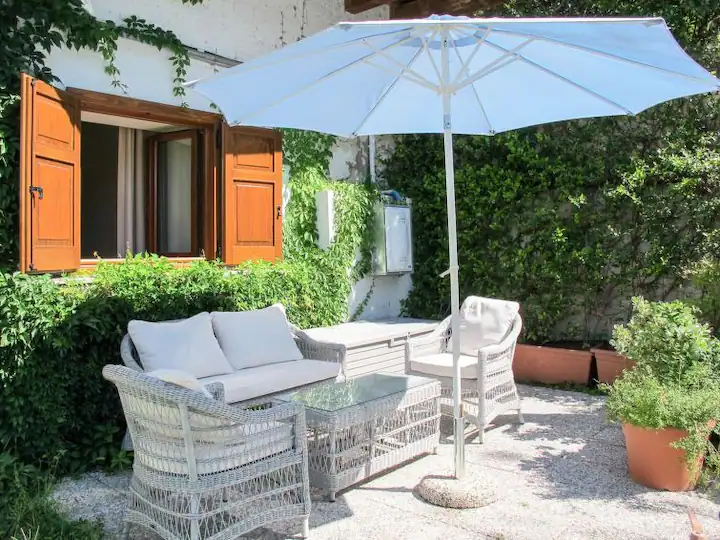 guests will have access to a panoramic private garden equipped with a table, chairs and sunshade, a relaxation area with a wicker sofa and sunshade, and an area with a table and chairs where smoking is permitted. They will be able to use the barbecue, washing machine and drying rack.