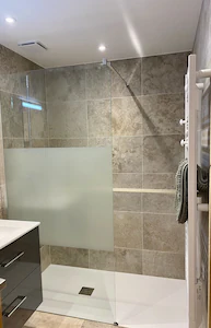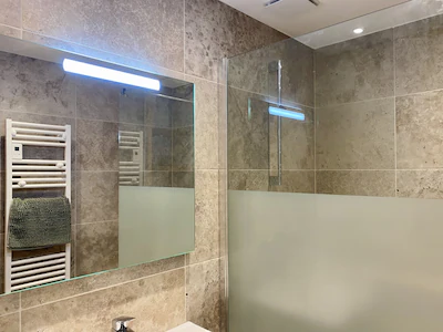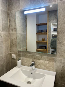 La salle de bain dispose d'un lavabo et d'une douche à l'italienne avec sèche serviette.