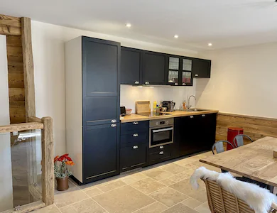 - Au 1er étage se trouve la pièce à vivre avec coin salon avec un canapé convertible 2 places et un coin cuisine/repas.