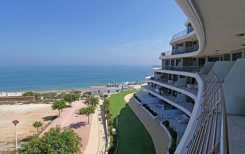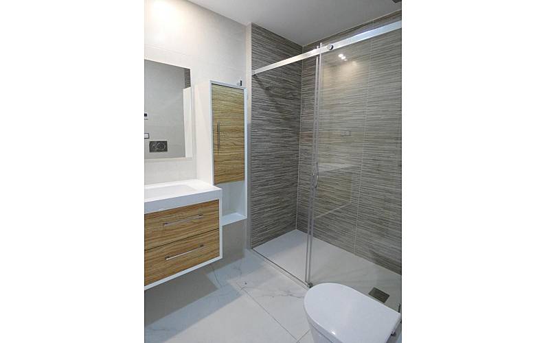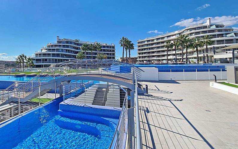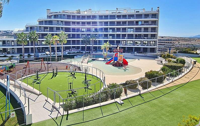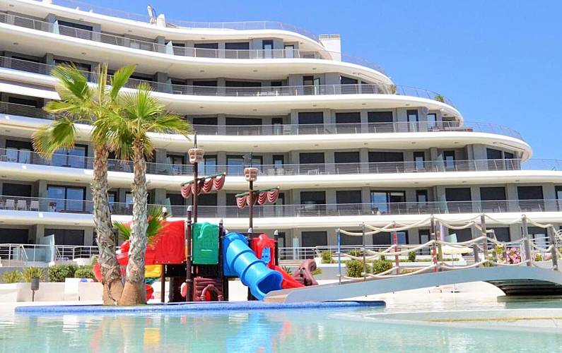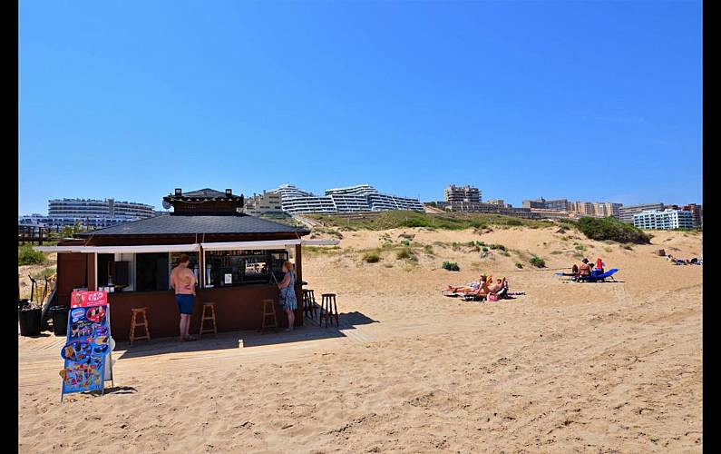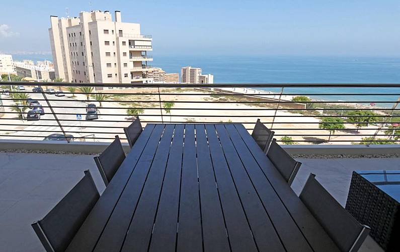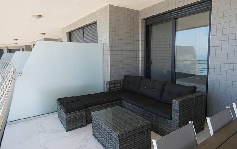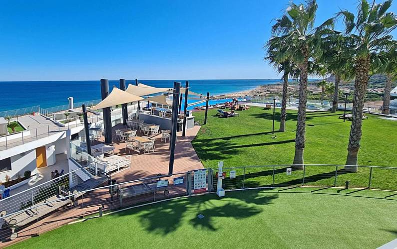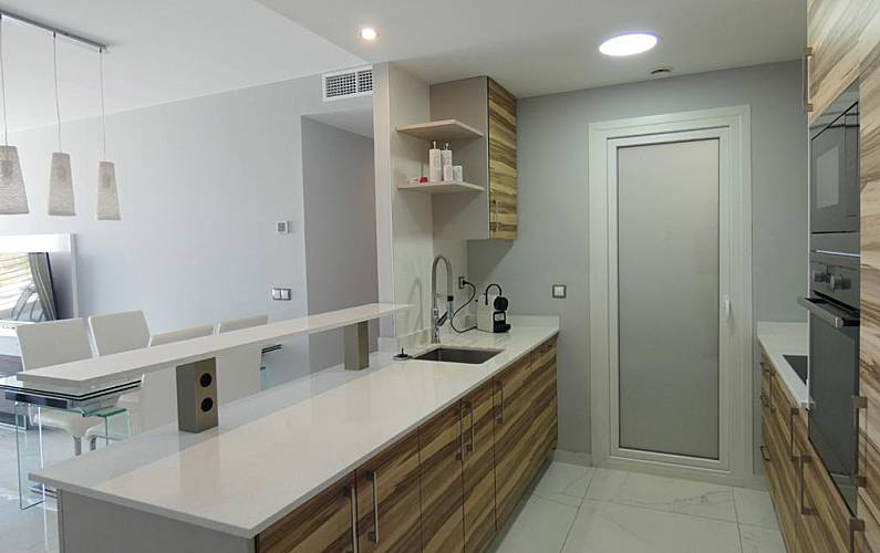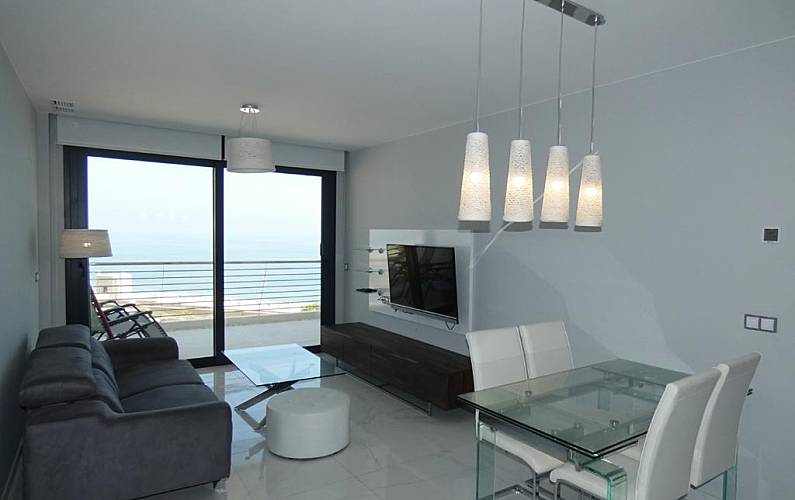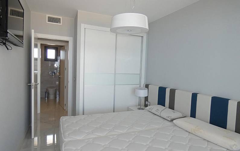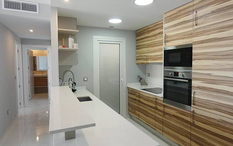 Apartamento con dos habitaciones: Habitación 1 con cama de matrimonio y baño en suite. Habitación 2 con dos camas de 90 cm. Baño independiente en el pasillo. Cocina americana totalmente equipada con galería (secadora y lavadora). Salón comedor con sofá cama para dos personas. Gran terraza con 30 m2.