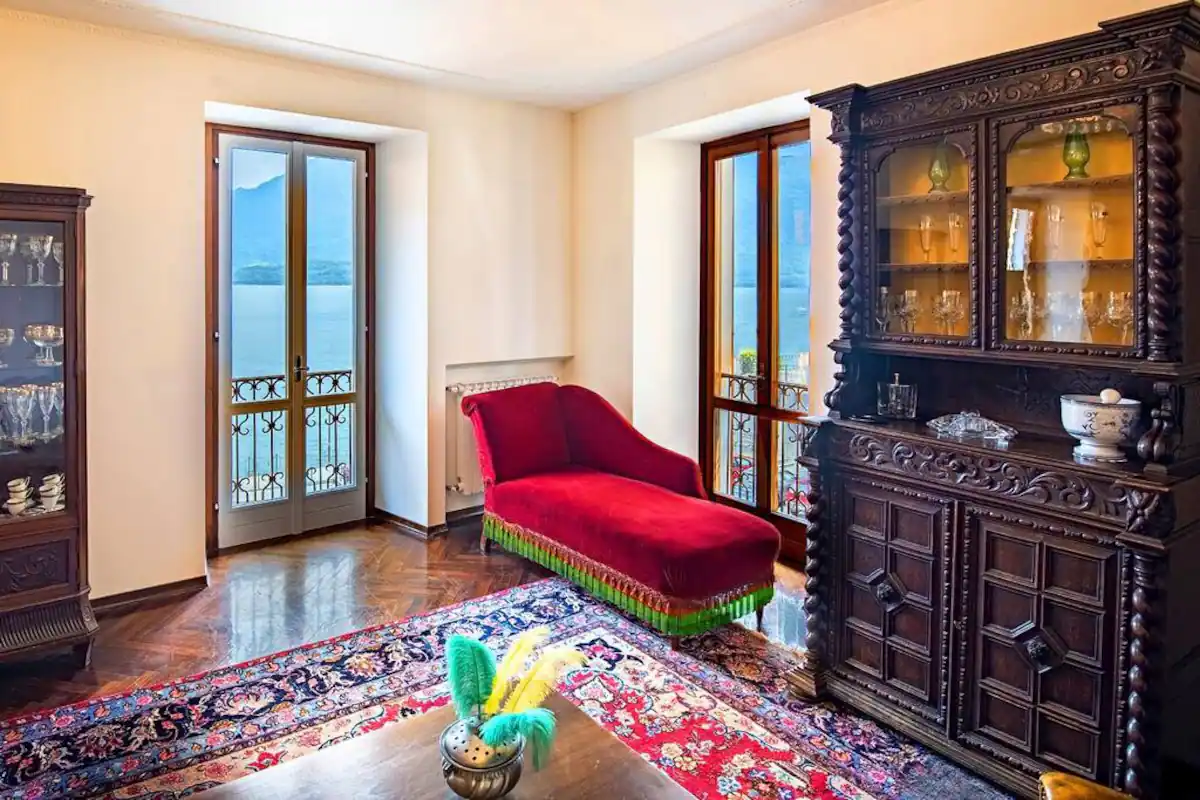 LUXURIOUS AND ELEGANT enormous apartment with fantastic lake view, and garden with splendid mountain view. Exquisite antique furniture, precious carpets, crystal chandeliers, vintage paintings on the walls, and an ALL-GOLD room. True old-style opulence.