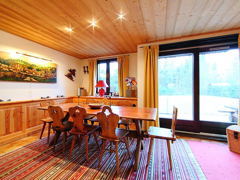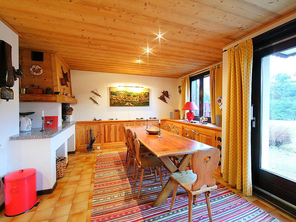 Well-kept garden, parking. Shop 2.5 km, shopping centre 2.5 km, restaurant 1 km, bus stop 500 m, railway station "Les Praz" 700 m. Golf course (18 hole) 1 km, tennis 1.5 km, sports centre 1.5 km, cable car 1 km, cross country ski track 2.5 km.