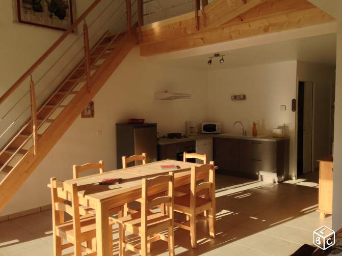 - une pièce à vivre séjour-cuisine avec canapé et télévision, cuisine équipée (lave-vaisselle, plaque de cuisson, four, frigo, micro-ondes, cafetière, grille pain, bouilloire, appareil à raclette et à fondue, vaisselle, produits ménagers, etc ...)
