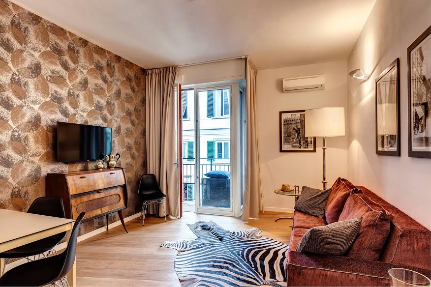 The dining area, furbished with designer table and chairs is next to the kitchen corner equipped with all necessary appliances (dishwasher, oven / microwave and small appliances). The living area, with a sofa bed comfortable for two people and a balcony with a great view on the roofs of old Florence, is enriched by designer furniture and features Flat TV, stereo, Wi-Fi.